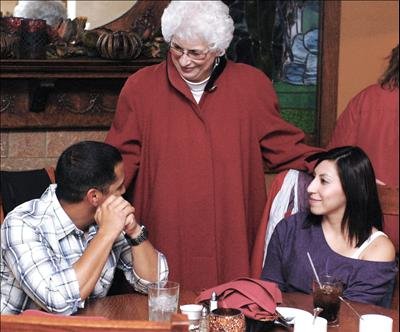 Big Bear Lake Mayor Liz Harris meets with Soldiers and their Families from 1st Squadron, 11th Armored Cavalry Regiment, during a traditional Thanksgiving dinner at the Robinhood Resort, Nov 23.